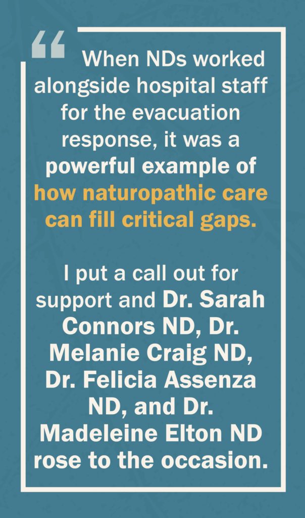 Dr. Joh: At the hospital where I work, reconciliation is not a checkbox- it is integrated into the web of practice. St. Joe’s has a holistic focus, prioritizing not just physical, but mental, emotional and spiritual care. We are renowned for our Mental health and addictions programs, specializing in renal, digestive and respiratory health which are pillars necessary for vitality. We also specialize in maternal and birthing care, foundations to intergenerational health. Our outreach includes care for youth, people experiencing homelessness, mental health supports in remote areas such as Nunavut, and rapid response care for evacuees displaced by the recent climate emergencies. When NDs worked alongside hospital staff for the evacuation response, it was a powerful example of how naturopathic care can fill critical gaps. I put a call out for support and Dr. Sarah Connors ND, Dr. Melanie Craig ND, Dr. Felicia Assenza ND, and Dr. Madeleine Elton ND rose to the occasion. Providing collaborative care for mostly displaced First Nations Peoples, they modelled just how well positioned our profession is for meeting people on a very human level where they are at! We are inherently interculturally considerate, gathering extensive patient histories and assessing people based on their wholistic contexts and circumstances- we continuously uphold and advocate for patient and community centered care. This level of inclusion shows how reconciliation can transform care on the ground.
